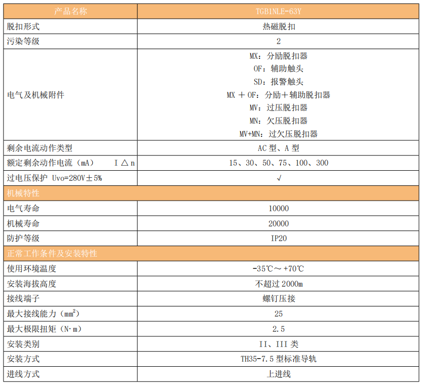 TGB1NLE-63Y 系列剩余电流动作断路器(以下简称漏电断路器)主要适用于交流 50Hz,额定工作电压 230V/400V,额定电流至 63A的线路中,当人身触电或电网泄露电流超过规定值时。剩余电流动作断路器能在极短的时间内迅速切断电源,保护人身及用电设备的安全,并且有过载、短路、